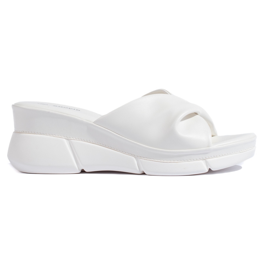 Essas cunhas brancas são inseridas, o que significa que colocá -las e tirá -las é extremamente simples e rápido. Sem nariz, eles são uma excelente alternativa às sandálias tradicionais, e seu design minimalista sem desenhos facilita a combinação com vestidos, calças ou shorts coloridos.
