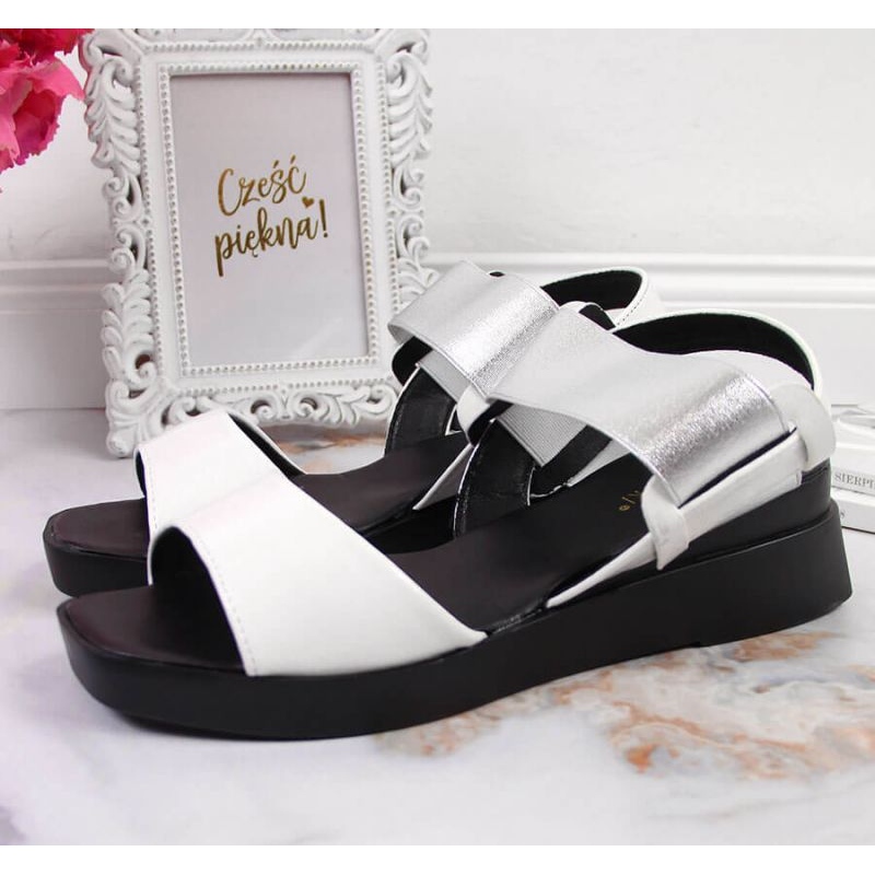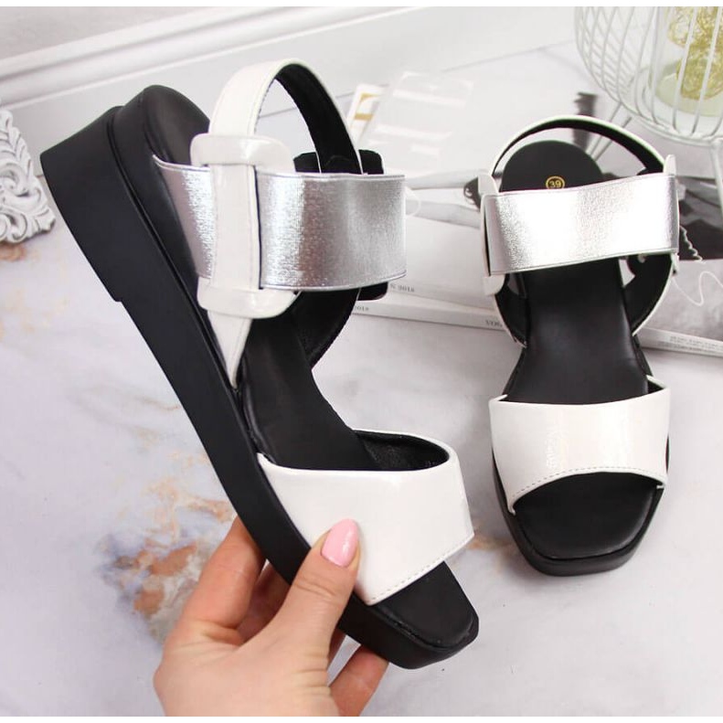 Sandálias de cunha Potocki elegantes e confortáveis em Wol75b são uma proposta para dias quentes de verão. A cor branca clássica faz o modelo se misturar perfeitamente com estilizações cotidianas e mais elegantes. Uma cunha de 5,5 cm de alta fornece suporte estável e alonga opticamente a figura, mantendo o conforto da caminhada.