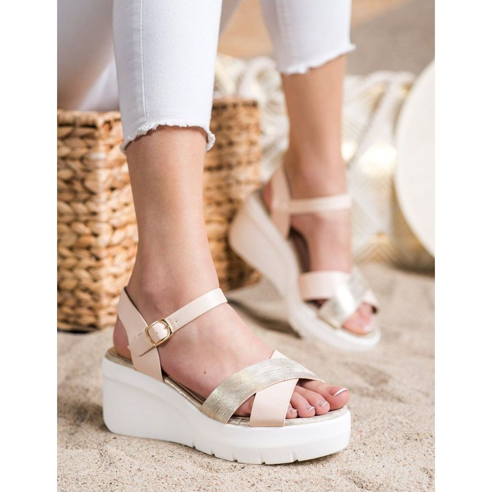 Descubra estilo e conforto únicos com sandálias de cunha Small Swan em bege com detalhes dourados. Estes elegantes sapatos femininos são a escolha perfeita para várias ocasiões - tanto para passeios noturnos como para todos os dias. Feitos de imitação de couro de alta qualidade, têm um aspecto extremamente moderno e ao mesmo tempo prático.