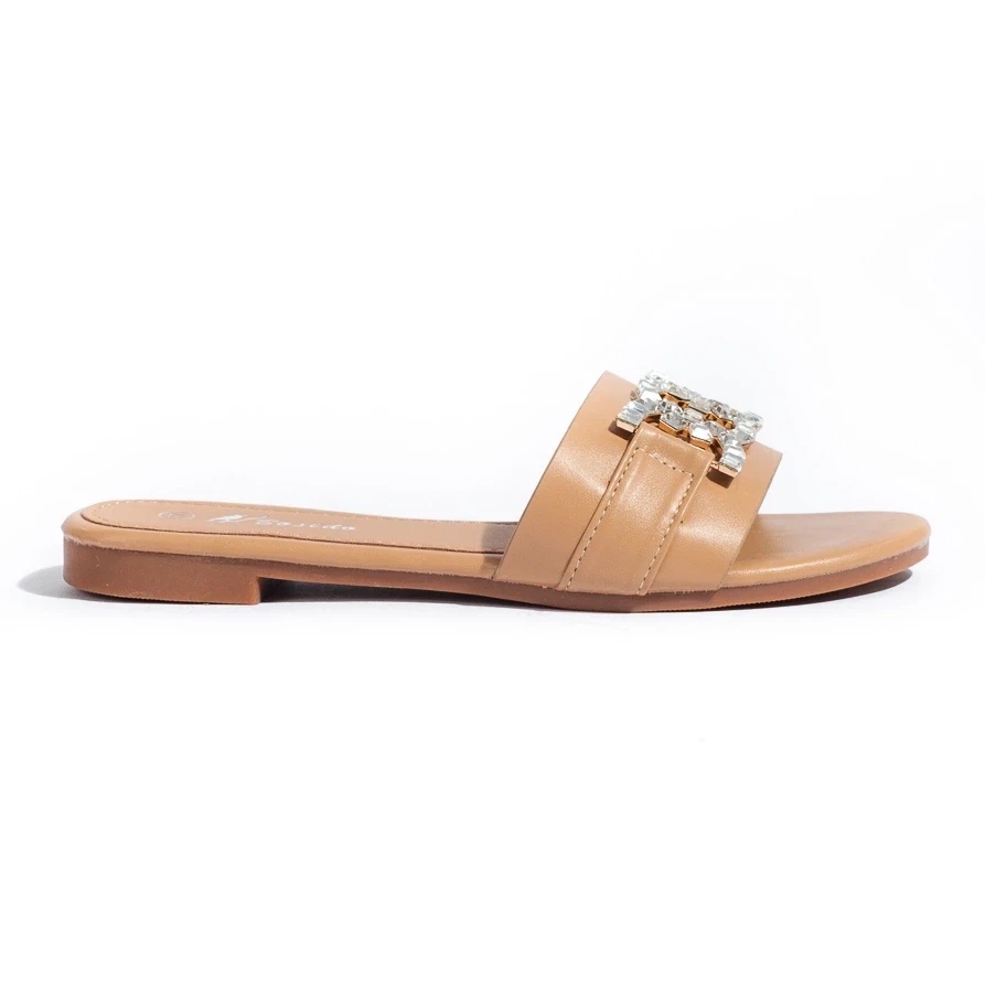 Flipes femininos femininos com uma fivela elegante - um clássico em uma edição moderna. Delicado bege (bege) e detalhes dourados criam um modelo universal que funcionará diariamente e durante as saídas de verão. Os strass sutis adicionam brilho, mantendo um caráter casual e moderado.