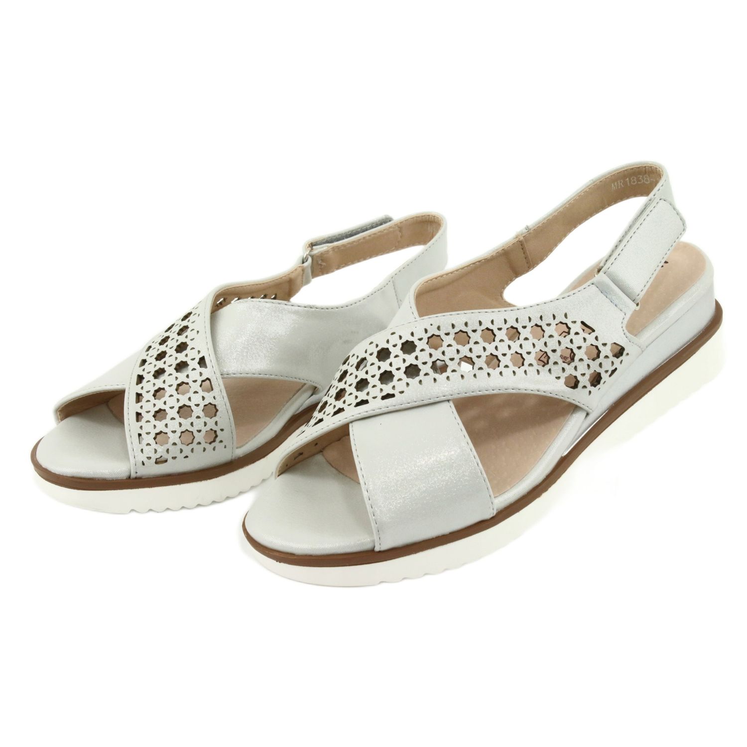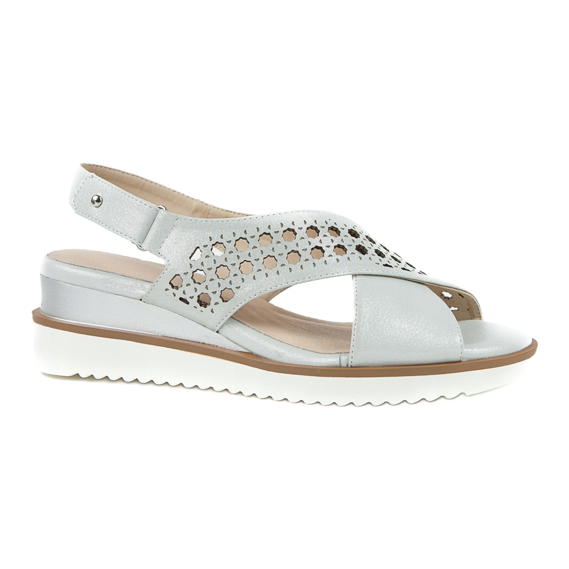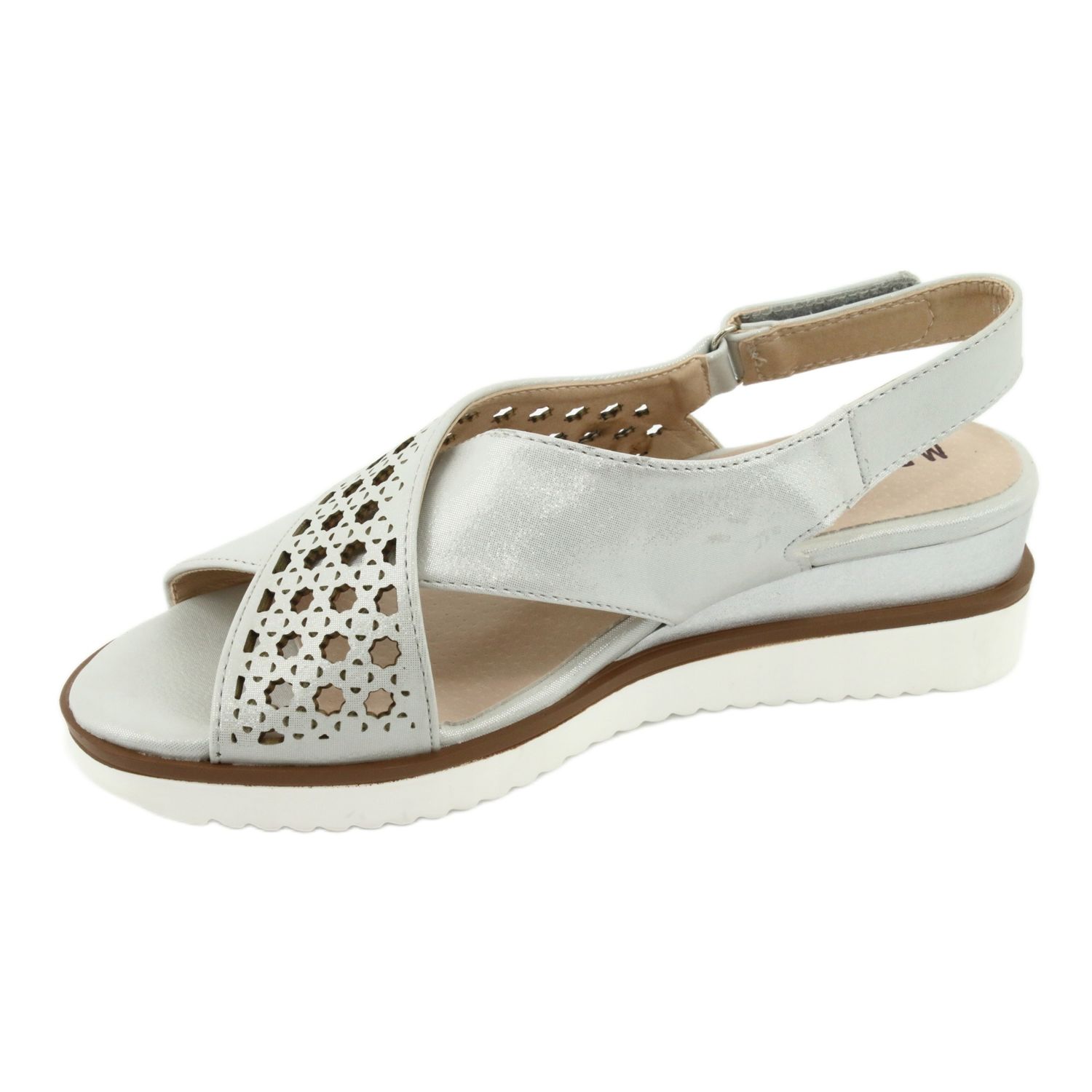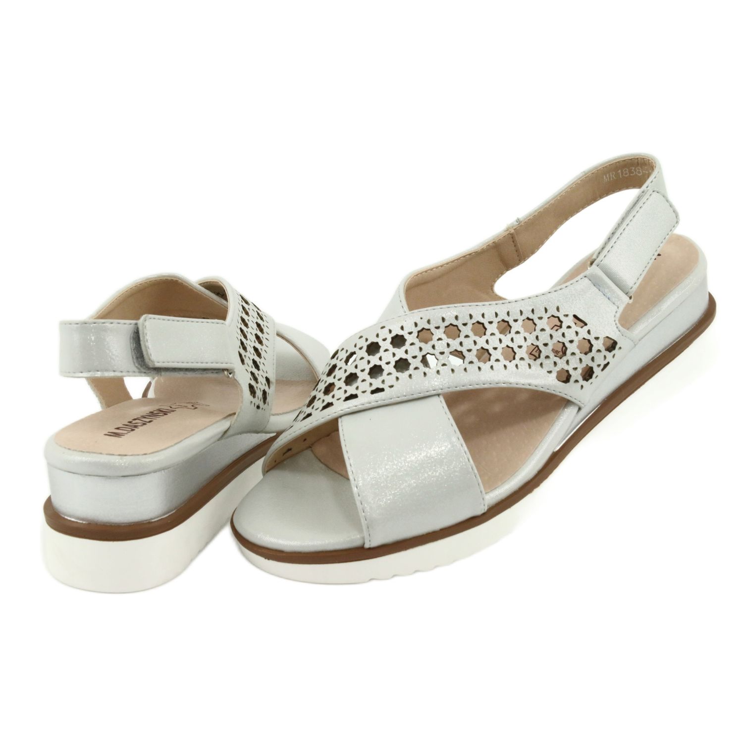 Descubra elegância e conforto em um dos mais recentes modelos de sandálias da M.Daszyński - sandálias de cunha Daszyński 1838 prateadas com acabamento cinza metálico. Estas atraentes sandálias são um must-have no guarda-roupa de toda mulher que aprecia estilo e moda clássica.