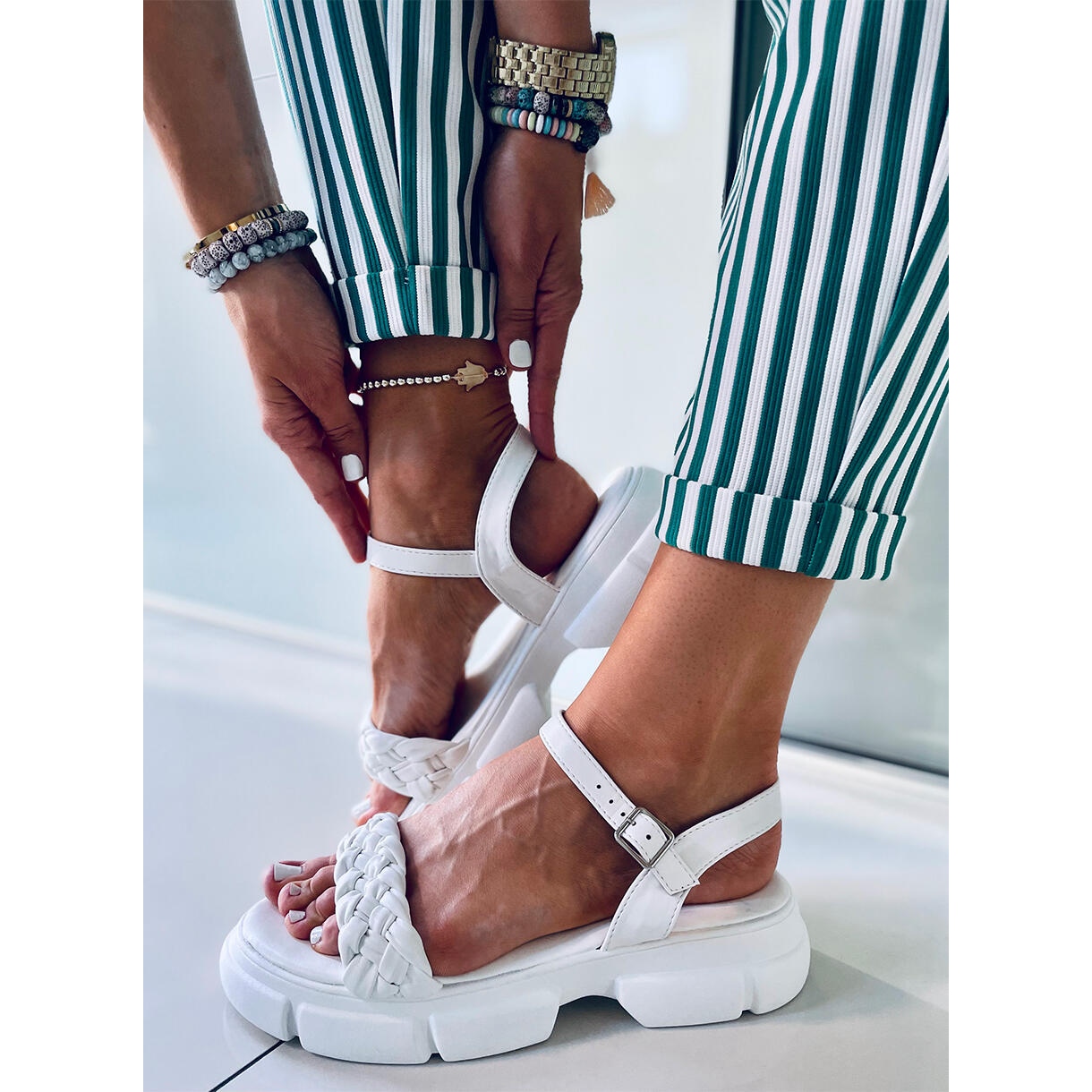 A tira trançada chama a atenção e combina perfeitamente com o design minimalista e suave das sandálias, o que as torna um complemento perfeito para qualquer estilo do dia a dia. Graças ao fecho com fivela, as sandálias são fáceis de calçar e ajustar, o que garante um ajuste perfeito ao pé.