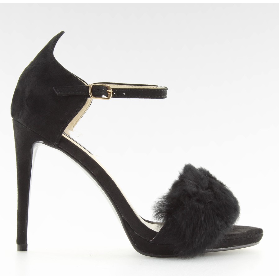 Elegantes sandálias pretas com salto fino de 11 cm de altura. Uma tira larga decorada com pêlo fofo acrescenta sensualidade e um caráter único, e uma tira com fivela no tornozelo estabiliza o sapato e garante uma fixação segura no pé. O modelo é confeccionado em camurça ecológica, a palmilha também é confeccionada em couro ecológico. A biqueira aberta enfatiza a silhueta feminina do pé - perfeita para saídas à noite e ocasiões especiais.