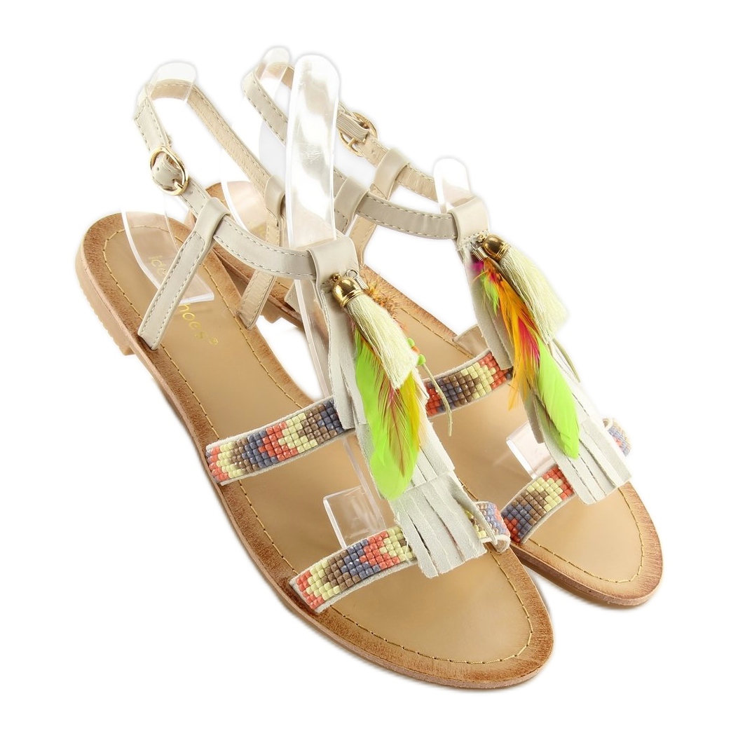 As sandálias são decoradas com aplicações de mosaicos brilhantes, franjas e delicadas penas, o que as torna atraentes e se destacam na multidão. A cor bege combina perfeitamente com outras tonalidades, criando um todo coerente e harmonioso.