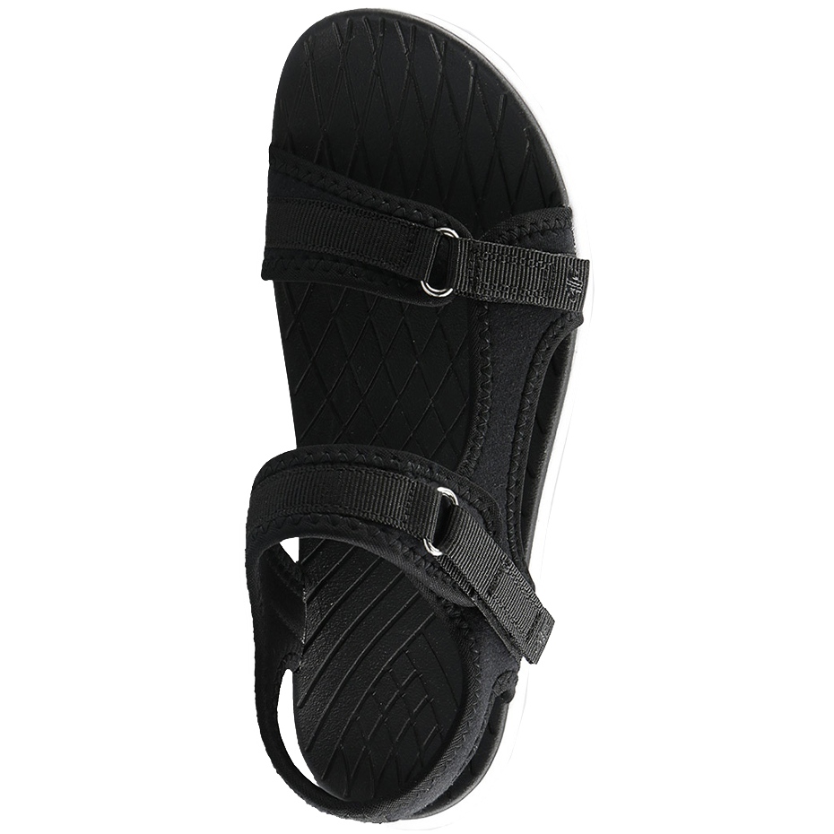 Sandálias femininas 4F abertas garantem o fluxo de ar livre durante os dias quentes. A parte superior leve e sintética e uma inserção de espuma EVA suave garantem o conforto do desgaste, e a sola EVA espuma com piso suprime os choques e melhora a adesão. O sistema de fixação de velcro duplo permite um ajuste rápido e conveniente, enquanto o salto descoberto e a falta de nariz enfatizam o caráter livre de verão dos sapatos.