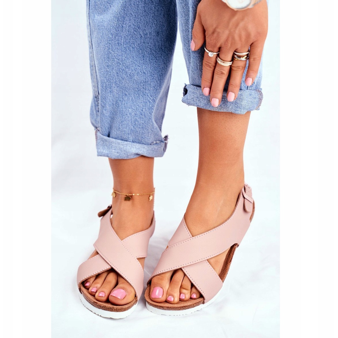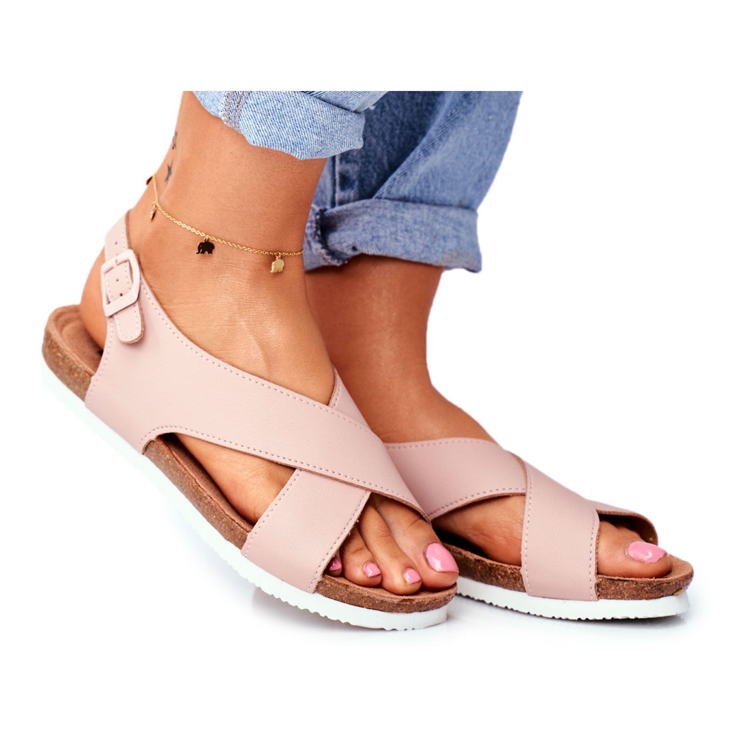 Estas sandálias clássicas certamente se tornarão a base de muitos estilos do dia a dia. Fixados com tira, permitem um ajuste perfeito aos pés, o que proporciona conforto adicional ao caminhar. Sua forma universal e cor rosa sutil fazem com que combinem tanto com vestidos atraentes e fluidos quanto com shorts casuais.