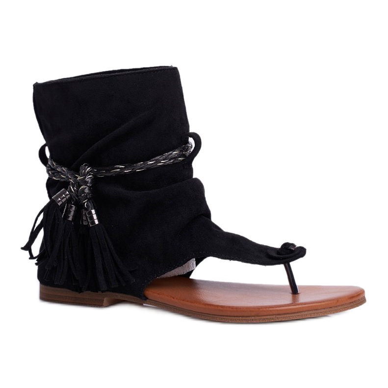 Estes chinelos pretos com franjas adicionais são uma combinação perfeita de estilo clássico e detalhes modernos. Confeccionados em couro camurça ecológico de alta qualidade, serão um complemento perfeito para qualquer estilo de verão. Têm salto plano de 2 cm de altura, o que os torna extremamente confortáveis mesmo quando usados por muito tempo.