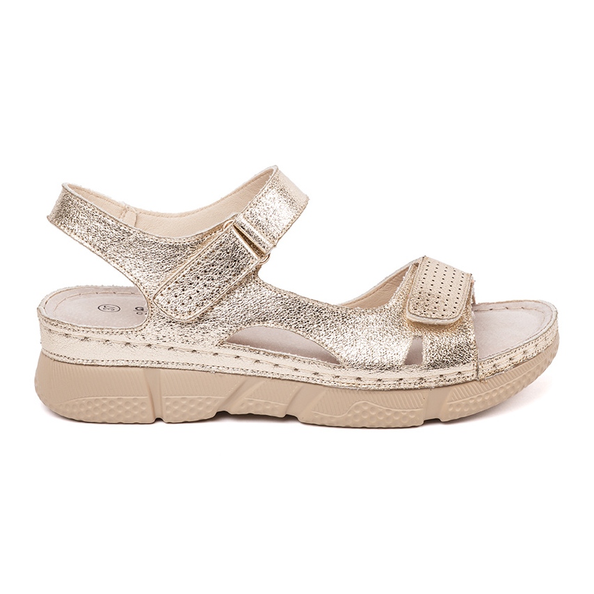 As sandálias têm um salto aberto e um nariz, o que garante excelente respirabilidade, e o salto plano com uma altura de 3,5 cm garante conforto durante longas caminhadas e reuniões de verão. A inserção de couro natural garante a suavidade em uso, e a fixação de velcro permite fácil colocar e tirar sapatos.