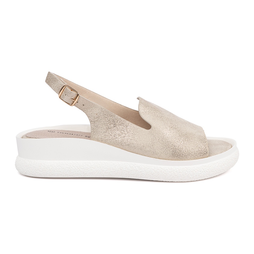A altura do calcanhar de 5,0 cm garante conforto no uso diário, enquanto enfatiza a figura. Os saltos abertos e a falta de nariz garantem excelente ventilação, o que torna essas sandálias perfeitas em dias quentes. Graças à fivela, é possível não apenas colocar e decolar, mas também o melhor ajuste ao pé.