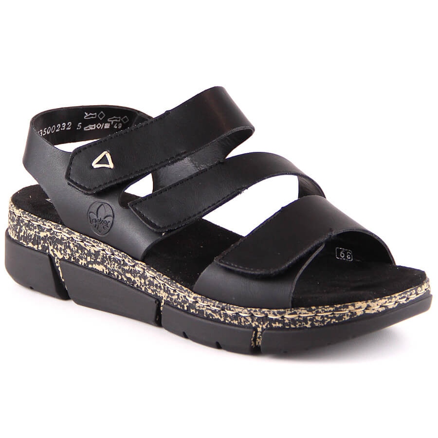 Detalhes: Sandálias femininas confortáveis em uma plataforma preta de velcro Rieker V2301-00 preto