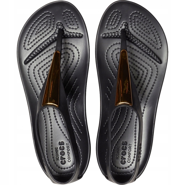 Detalhes: Sandálias femininas Crocs Serena Metallic Bar Fp W pretas e douradas 206420 751 preto dourado