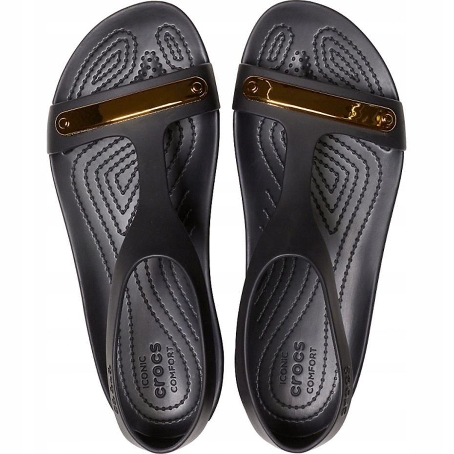 Detalhes: Sandálias femininas Crocs Serena Metallic Bar Sdl W preto-ouro 206421 751