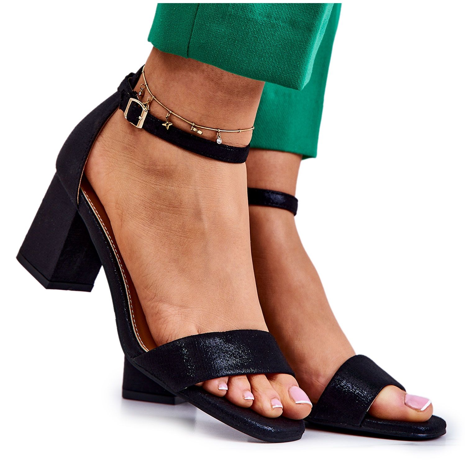 Sandálias femininas elegantes feitas de tecido brilhante que combinam perfeitamente estilo e conforto. Um post estável e amplo (aprox. 7 cm) fornece uma certa etapa, e a inserção de couro ecológica suave dá conforto mesmo durante o uso mais longo. O modelo possui um salto rígido, um nariz aberto e um solavanco com uma fivela presa ao redor do tornozelo - perfeita para casamentos, festas e passeios de verão, eles se misturam bem com vestidos e calças elegantes.