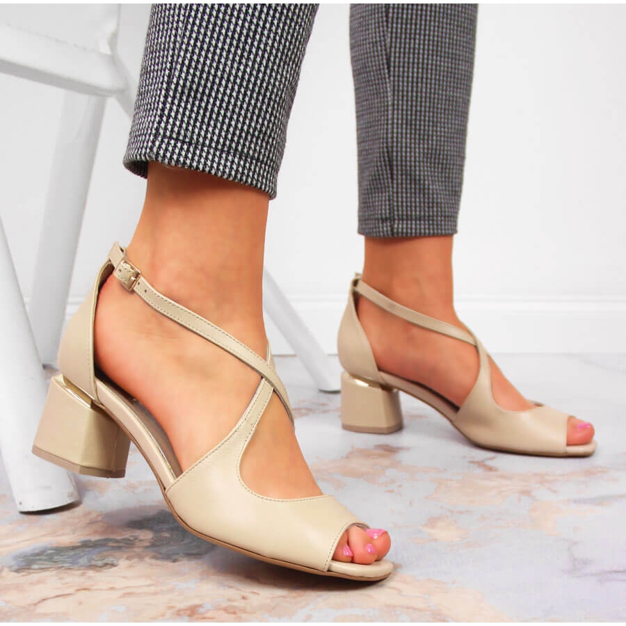 Detalhes: Sandálias femininas de couro bege com salto alto Juma
