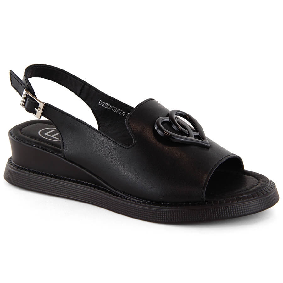 O modelo DS6069 caracteriza-se por um corte clássico e cor preta, o que o torna um complemento universal para qualquer look. O interior das sandálias é equipado com palmilha em couro macio que garante conforto o dia todo, e a altura da cunha de 4,5 cm confere elegância sem sobrecarregar os pés.