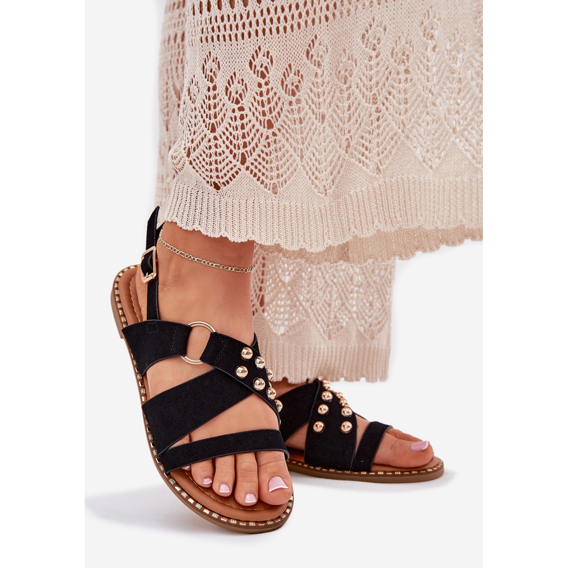 Não espere - escolha saltos planos femininos com pregos de ouro e enfatize seu estilo neste verão! Verifique também o filme para ver como eles ficam ótimos no movimento: [link para o filme] (https://butoskp.cfolks.pl/bs/product_video/38211.mp4).