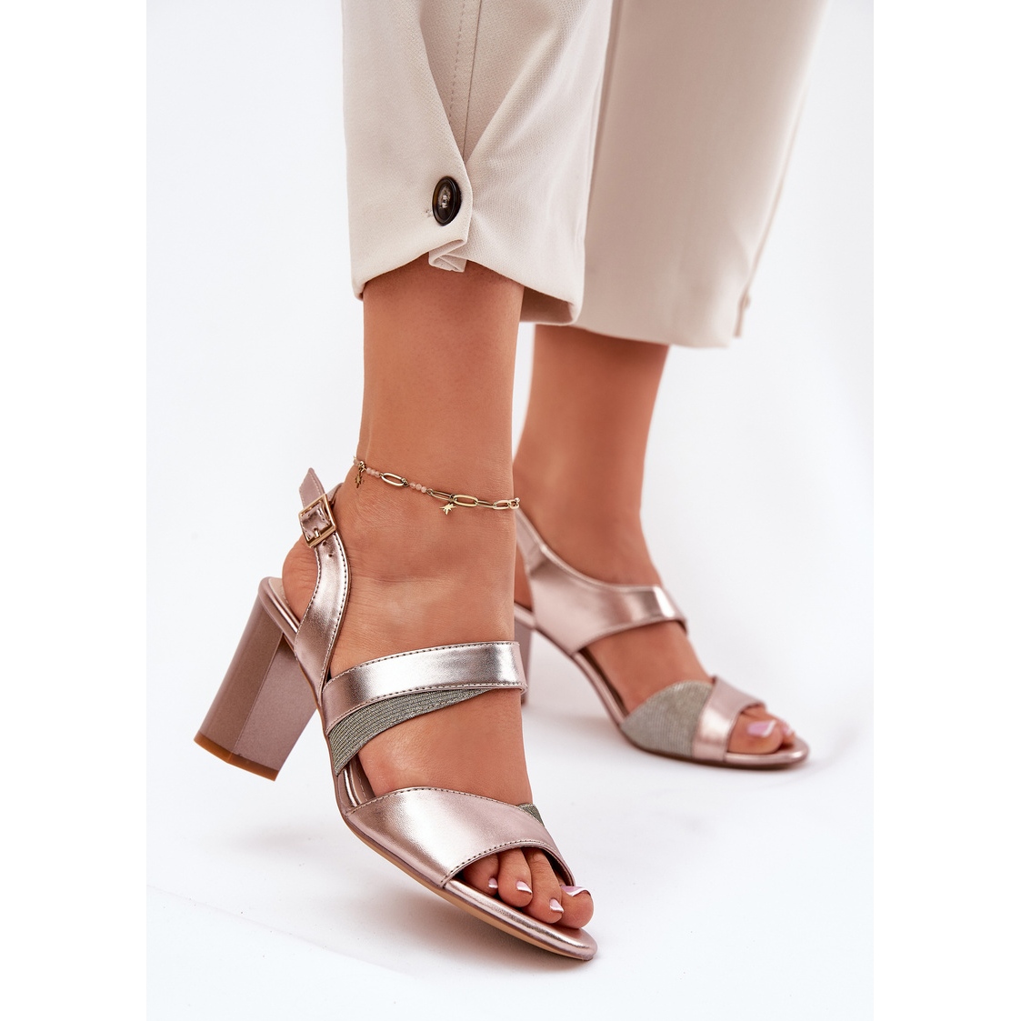 Graças à sola bege feita de plástico durável, essas sandálias se adaptarão facilmente a muitos estilos, além de adicionar elegância a eles. Uma vantagem adicional é a sombra metálica, que adicionará brilho a todas as roupas.