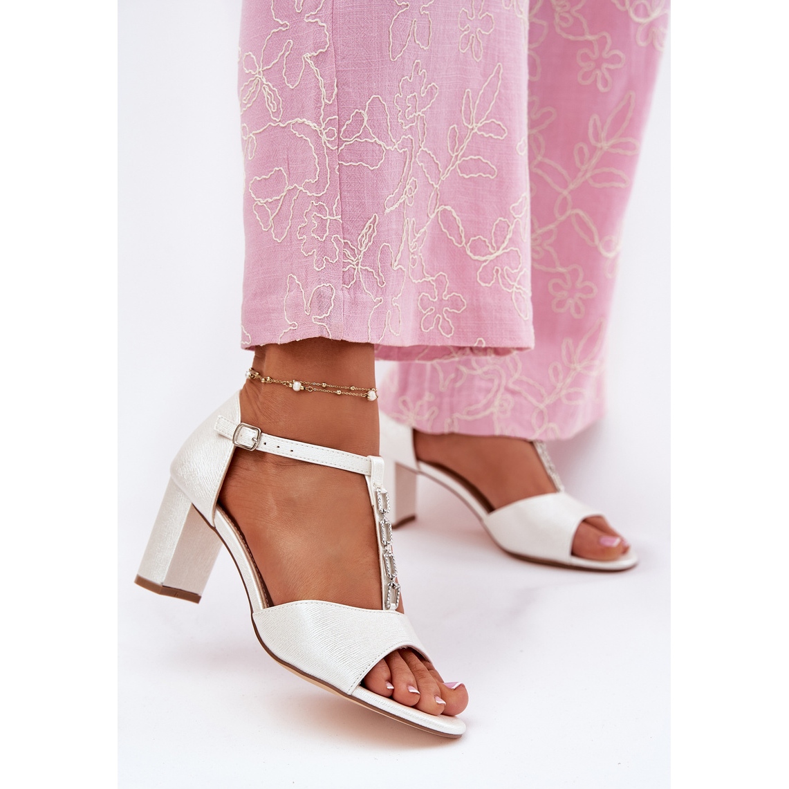 Uma faixa decorativa com zircões dá a eles um charme sutil, o que os torna uma escolha ideal para várias ocasiões - desde saídas diárias a eventos mais formais. Graças ao design clássico, as sandálias Evento podem se adaptar facilmente a muitas roupas, enfatizando sua feminilidade.