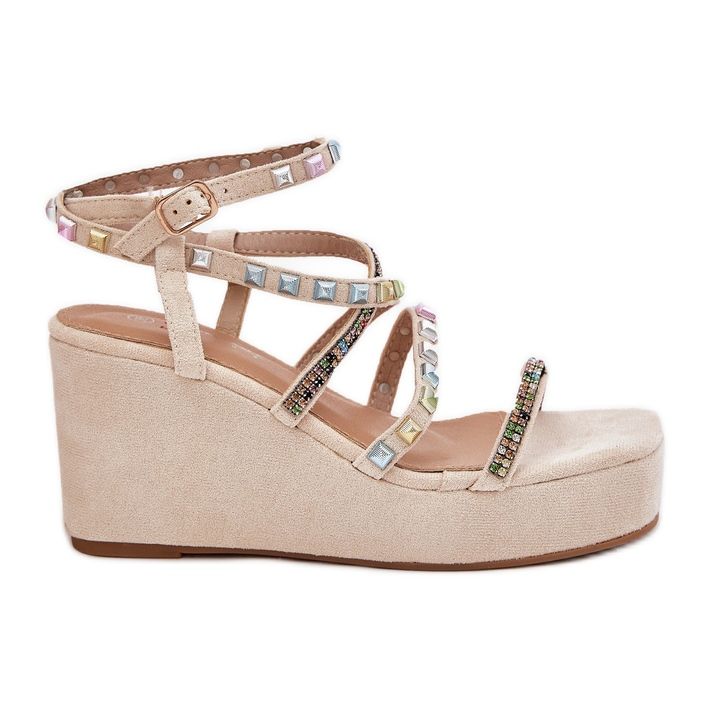 Descubra as sandálias de cunha feminina perfeitas que combinam elegância e conforto nos dias de verão! Nossas sandálias bege, feitas de camurça ecológica de alta qualidade, atraem os olhos com tiras decoradas que lhes dão um personagem único. Graças à fivela, cada par fornece um ajuste perfeito para a forma do pé, o que os torna não apenas elegante, mas também extremamente confortável.