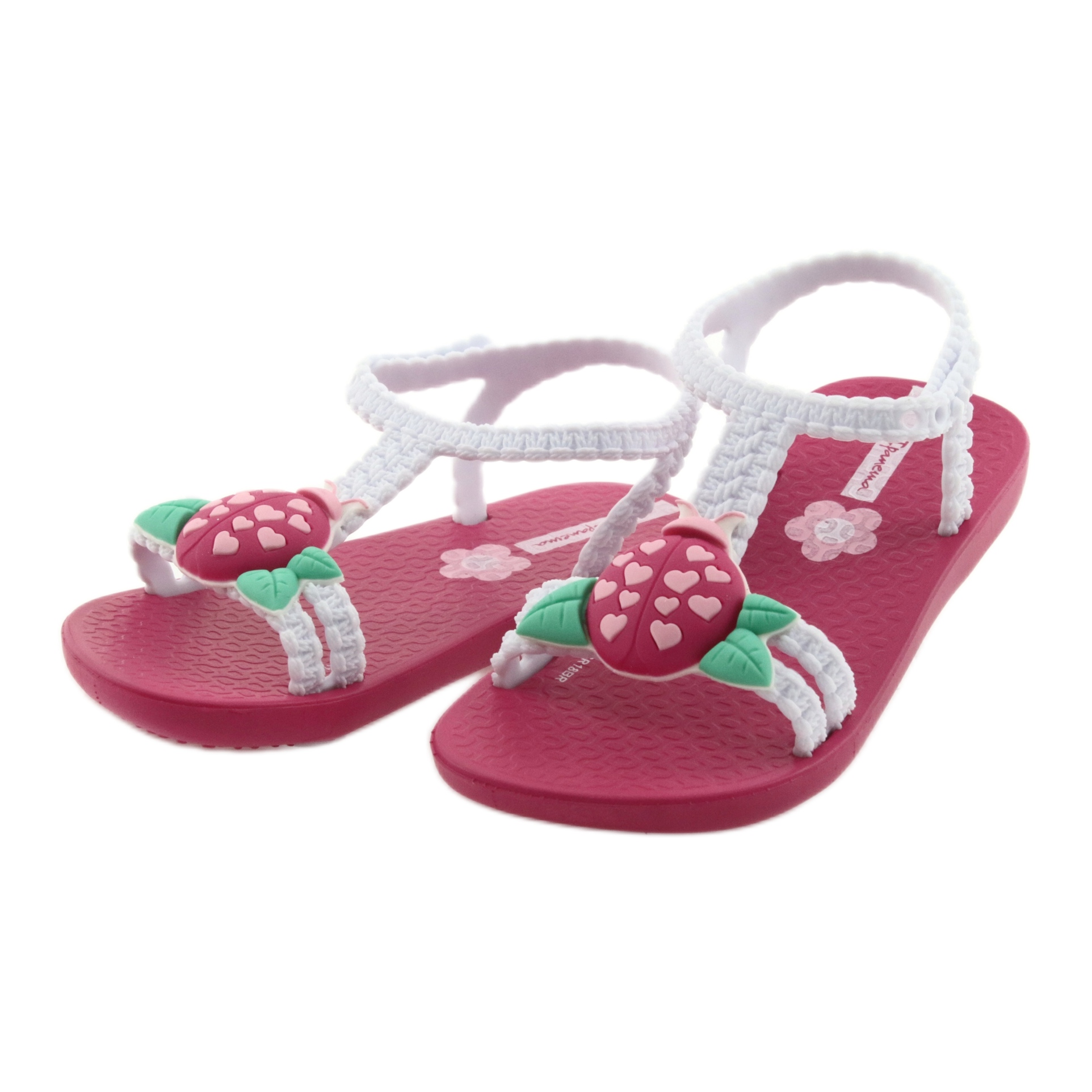 O motivo de uma joaninha com corações sobre folhas verdes vai certamente atrair a atenção dos mais novos e fazer das sandálias o seu calçado preferido. Graças à sua elevada durabilidade, as crianças poderão usá-los durante toda a temporada, desfrutando do seu aspecto original.