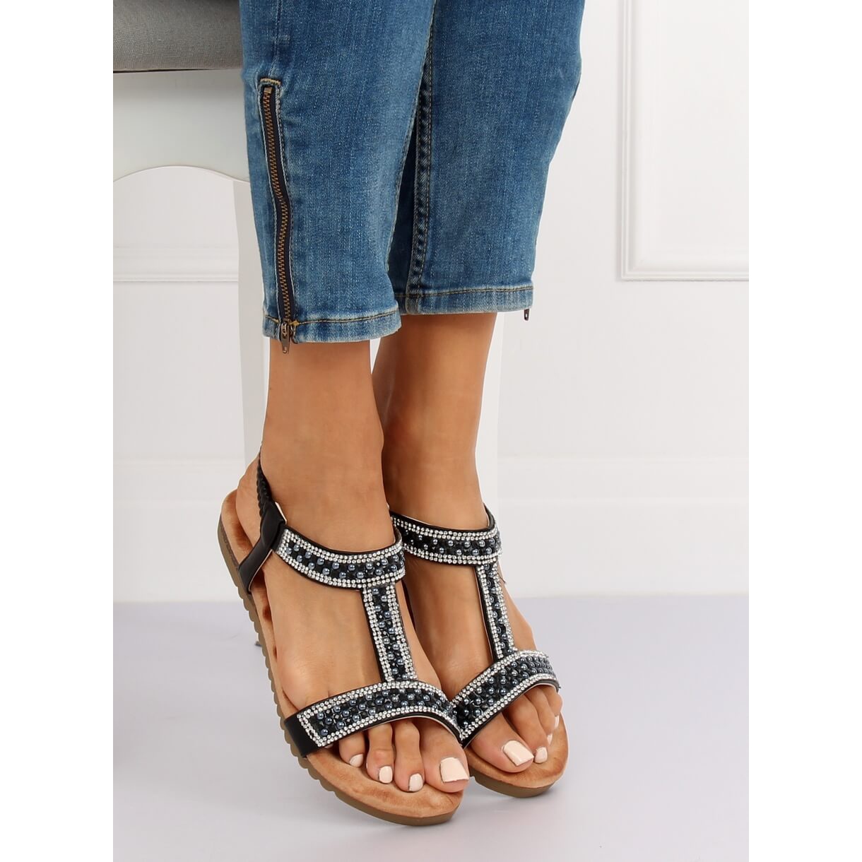 Estes sapatos extremamente elegantes têm tiras finas e sutis que enfatizam perfeitamente a figura feminina. Uma vantagem adicional são as decorações em forma de strass, que lhes conferem um caráter único. Além disso, o salto plano de 2 cm torna-as numa sandália perfeita para o dia a dia, garantindo liberdade de movimentos e conforto.