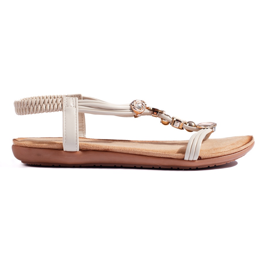 A cor bege da moda combinada com acessórios elegantes na forma de zircões e strassina torna essas sandálias um complemento perfeito para estilizações clássicas e de moda. O corte inserido faz com que a saída e a decolagem seja rápida e sem problemas, e um salto plano com uma altura de 3 cm garante conforto, mesmo durante o desgaste a longo prazo.