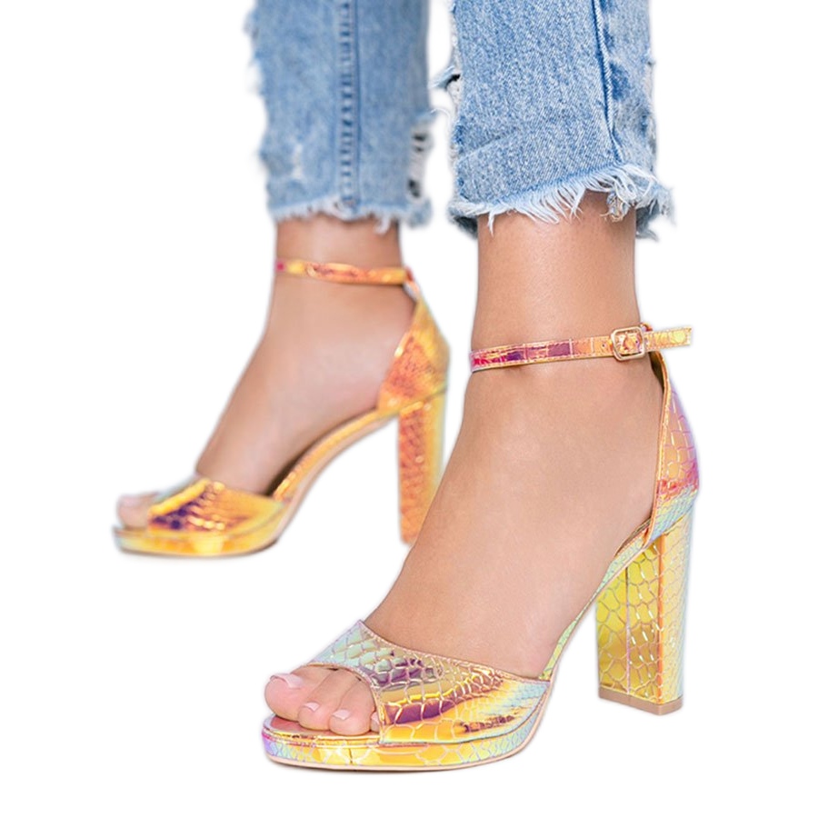 Detalhes: Sandálias holográficas douradas no posto Millo dourado