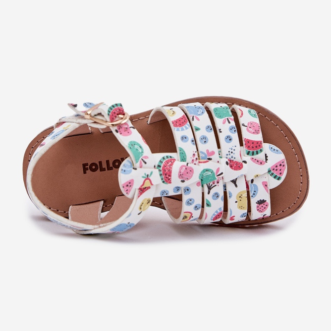 Detalhes: Sandálias infantis com couro ecológico em frutas multicoloridas branco