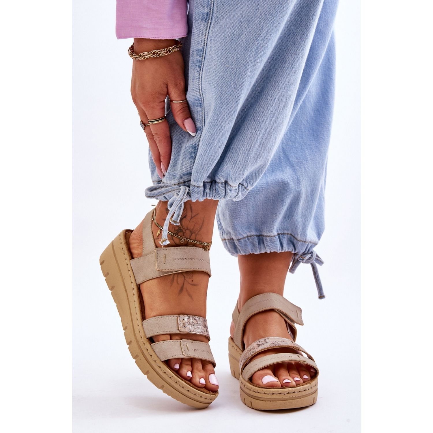 As sandálias foram equipadas com um fechamento prático de velcro, o que facilita a instalação e o ajuste do pé. A cor bege se adapta a muitos estilos, de casual a mais elegante, o que os torna uma adição universal ao guarda -roupa.
