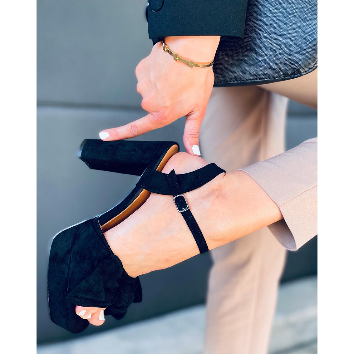As sandálias plataforma Adella Black são uma proposta que certamente irá satisfazer todos os amantes da moda. Estas elegantes sandálias pretas confeccionadas em camurça ecológica aliam conforto e estilo, sendo a escolha perfeita tanto para os passeios do dia a dia como para ocasiões mais especiais.