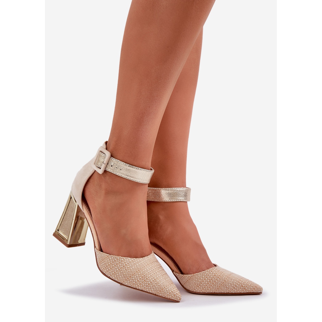 Sandálias em um post com dedos pontiagudos em uma bela cor dourada são uma proposta ideal para mulheres que desejam enfatizar sua singularidade e estilo. Feito de camurça ecológica, eles se deleitam com um visual moderno e um acabamento elegante. Um salto de 9 cm de altura com altura de espelho com um espelho, os detalhes dourados lhes dão um brilho único, o que faz com que cada estilização ganhe expressividade.