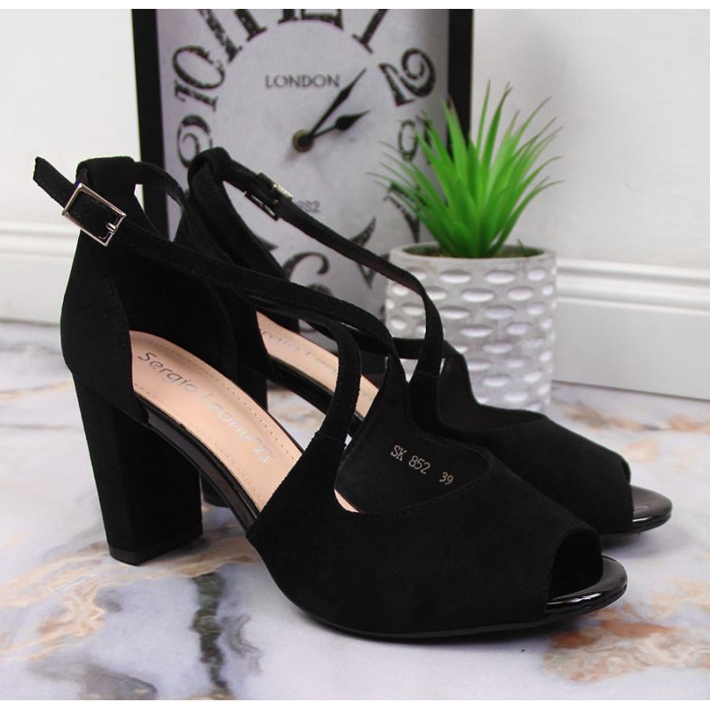 Sandálias no Sergio Leone Post em SK210C - Um clássico em Black, que funcionará nas estilizações de verão. Um corte elegante com um dedo do pé aberto e um salto estável como um post (8,5 cm) combina um visual feminino com o conforto de usar. Perfeito para todos os dias e para passeios noturnos.