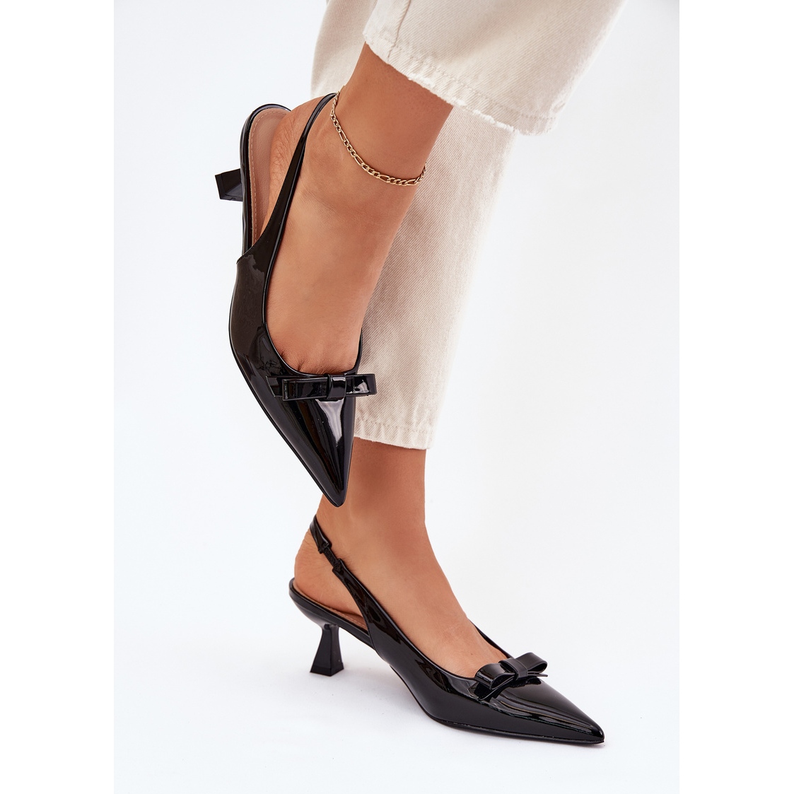 Descubra a elegância e a feminilidade com sandálias envernizadas em um alfinete com um arco em uma cor preta clássica. Essas sandálias femininas únicas, feitas de couro ecológico de alta qualidade, são uma ótima opção para ocasiões especiais. Seus narizes pontiagudos acrescentam magro à figura, e o arco sutil colocado na frente lhes dá um charme único.