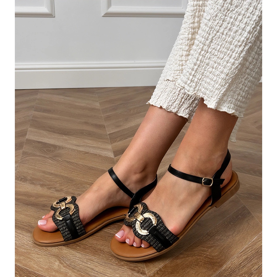 Detalhes: Sandálias planas pretas com uma decoração de ouro preto