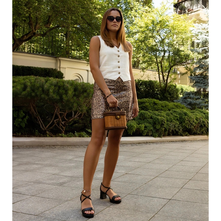 Essas sandálias são distinguidas pela funcionalidade graças a uma fivela prática, que permite combinar perfeitamente com o pé, o que é importante para manter o conforto durante longas caminhadas de verão. A altura do calcanhar de 7,5 cm acrescenta leveza à figura e, ao mesmo tempo, é estável o suficiente para poder desfrutar da liberdade de movimento.