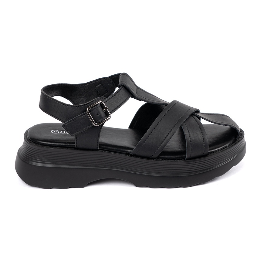 Aqui estão sandálias pretas na sola espessa de Goodin, que certamente atrairá sua atenção! Perfeito para os dias de verão e passeios à noite, essas sandálias combinam elegância e se confortando. Feito de couro ecológico de alta qualidade, tanto no topo quanto no interior, garante durabilidade e aparência estética.