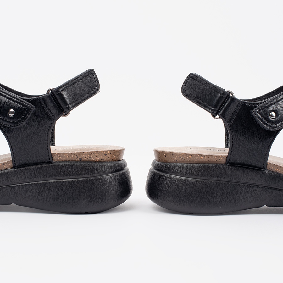 O calcanhar aberto e a falta de um nariz garantem a liberdade de movimento, e a plataforma de 3,5 cm de alta enfatiza a figura, garantindo a estabilidade. Uma sola de plástico liso fornece boa adesão em várias superfícies, o que as torna a escolha perfeita para qualquer ocasião. As sandálias são presas com velcro prático, o que facilita e as tiram extremamente fácil.