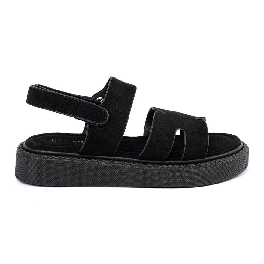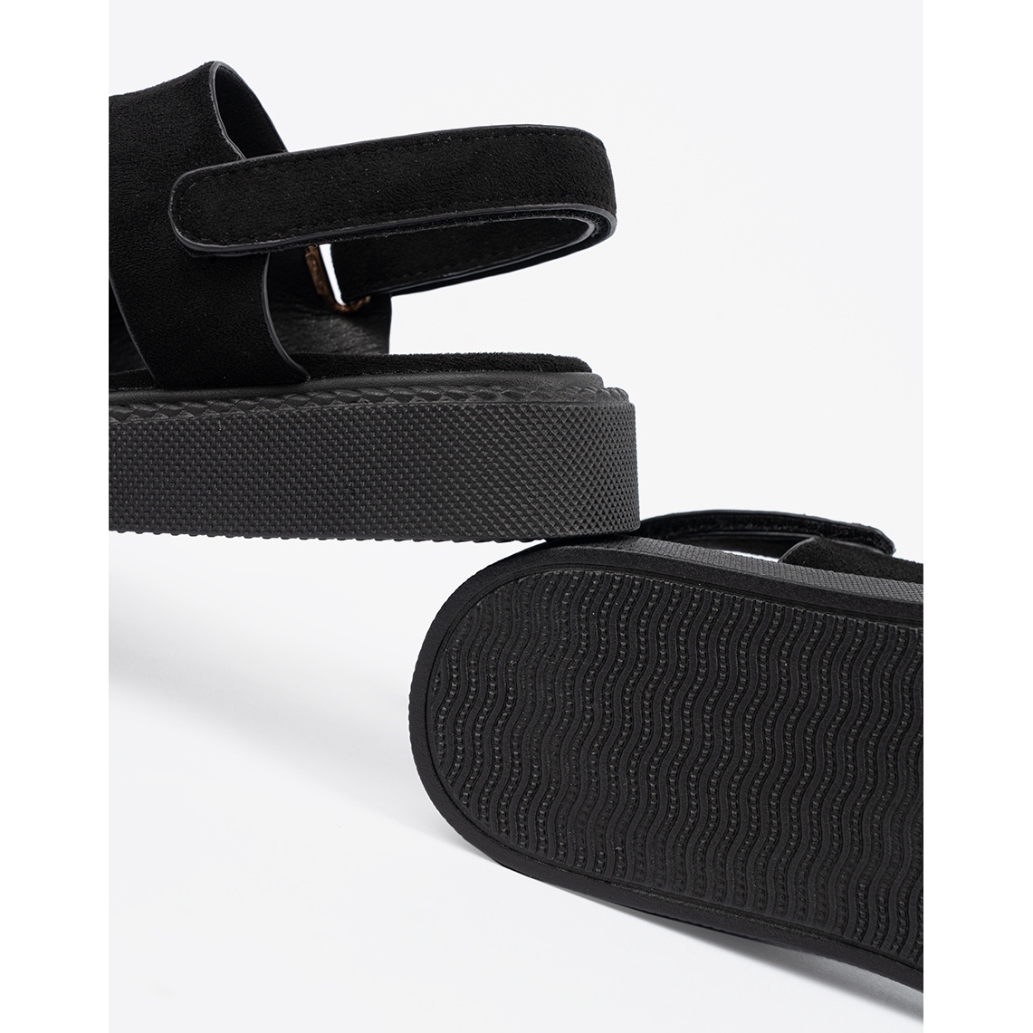 As sandálias têm um salto aberto, que promove a ventilação das pernas e permite a livre circulação. Graças à plataforma de 3,5 cm de alta, cada etapa se torna leve e confortável. O acabamento preto permite que você combine facilmente com várias estilizações - de roupas diárias a criações elegantes.