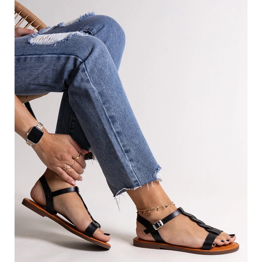 As sandálias planas pretas amaranto são a escolha perfeita para os dias de verão, combinando estilo e conforto. Feito de couro ecológico de alta qualidade, eles garantem o conforto de usar, mesmo em dias quentes. Seu design clássico os torna bem se misturam com várias estilizações - de casual a mais elegante.