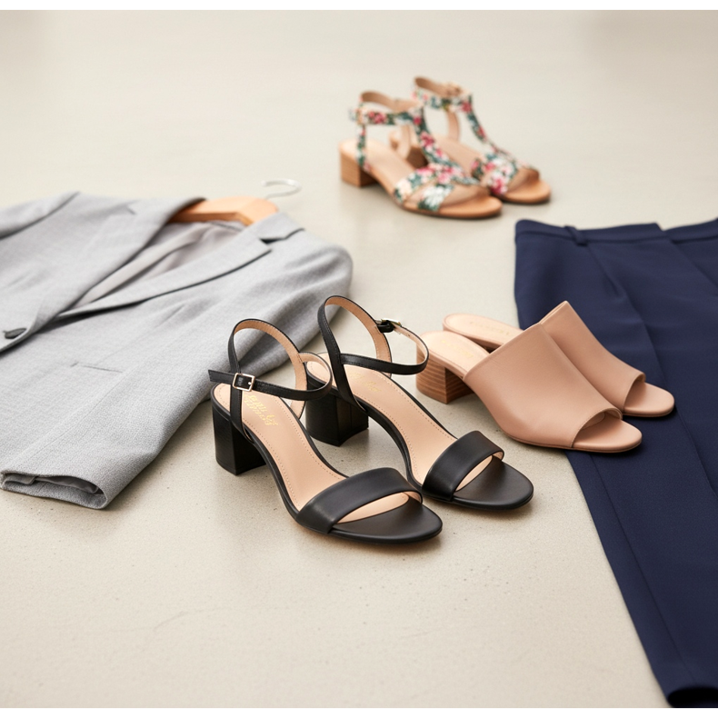 Em escritórios com código de vestimenta formal, opte por sandálias de salto alto ou mulas em cores suaves. Evite estilos com muitas listras, dedos abertos ou padrões tropicais. Sandálias de couro com salto de 6 a 8 cm na cor preta ou nude são a melhor escolha nesse ambiente.
