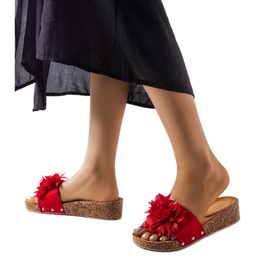 Estes chinelos femininos distinguem-se pela sua bela cor vermelha e um pompom decorativo em forma de flor, que lhes confere originalidade. Confeccionados em couro camurça ecológico, não são apenas estéticos, mas também ecologicamente corretos. A borracha com que é feita a sola proporciona excelente aderência e conforto de uso.