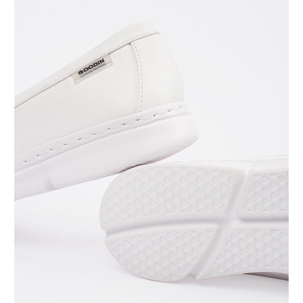 A cor branca dos mocassins Goodin os faz com que eles se misturem perfeitamente com várias estilizações - de vestidos de verão a calças leves. Além disso, a altura da plataforma de 3 cm fornece um aumento sutil, sem desistir da conveniência.