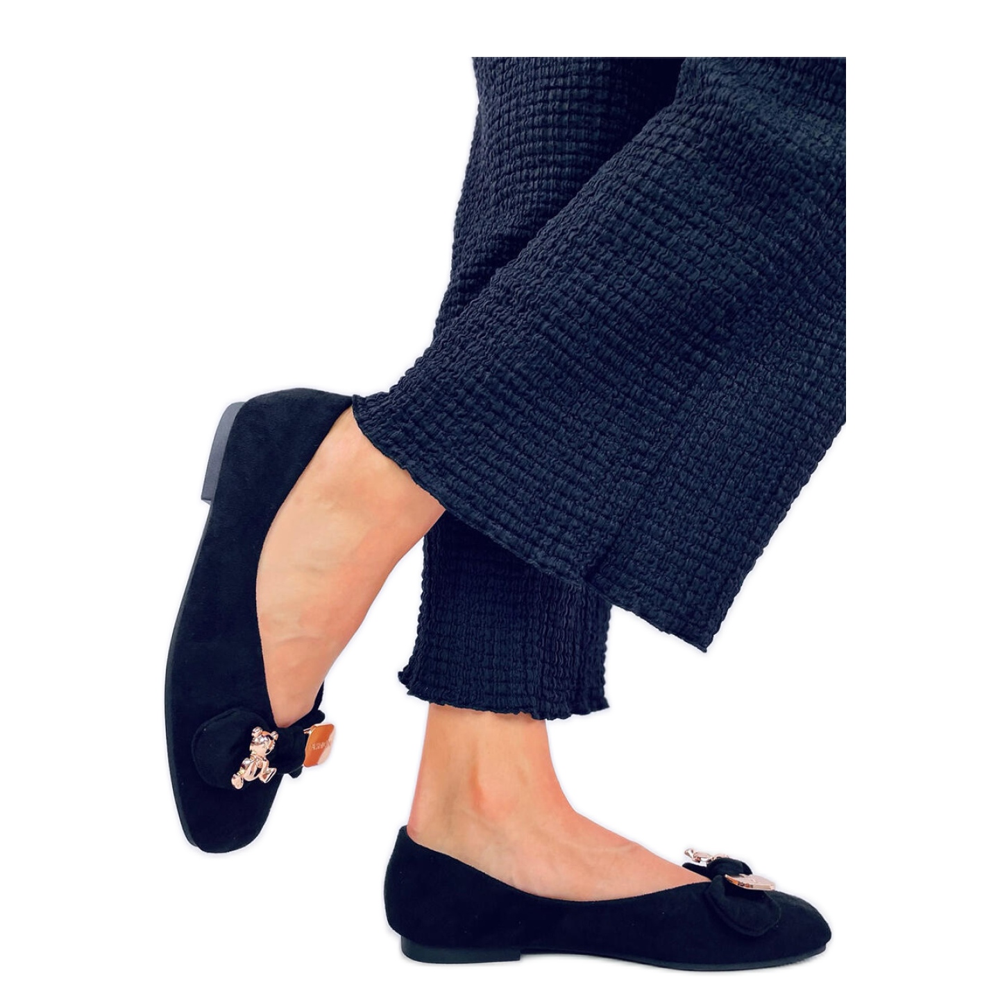 As bailarinas negras fazem com que elas se encaixem em muitos estilos - do dia a dia a mais elegante. Um corte limpo com ferramentas quadradas lhes dá originalidade e um laço encantador com um alfinete de segurança dourado e um urso de pelúcia chama a atenção, dando aos sapatos um personagem único.