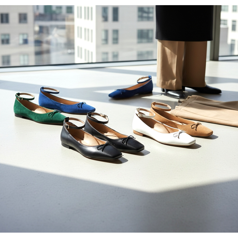 Sapatilhas de bico quadrado ficam especialmente bem com calças retas e saia lápis. Usados com um terno elegante ou um conjunto de escritório, são uma alternativa perfeita aos saltos altos - permanecem elegantes e garantem conforto durante todo o dia de trabalho.
