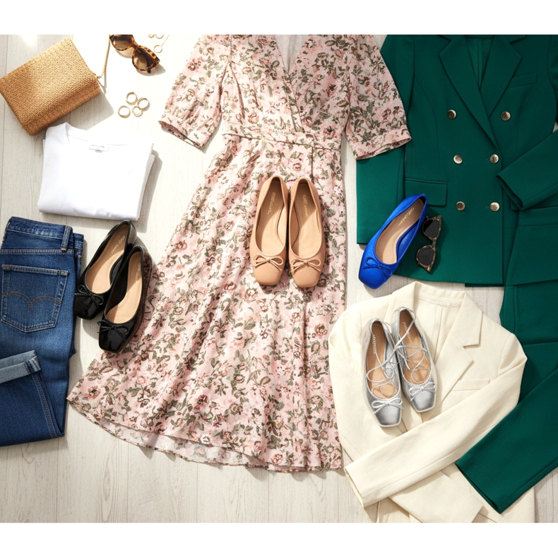 Para um vestido de primavera - escolha sapatilhas nude ou bege claro com um vestido midi floral. Esta combinação cria uma linha vertical ininterrupta, fazendo com que as pernas pareçam opticamente mais longas. Para um vestido de cor intensa (cobalto, esmeralda), opte por sapatilhas de cor neutra que não vão competir com sua roupa.