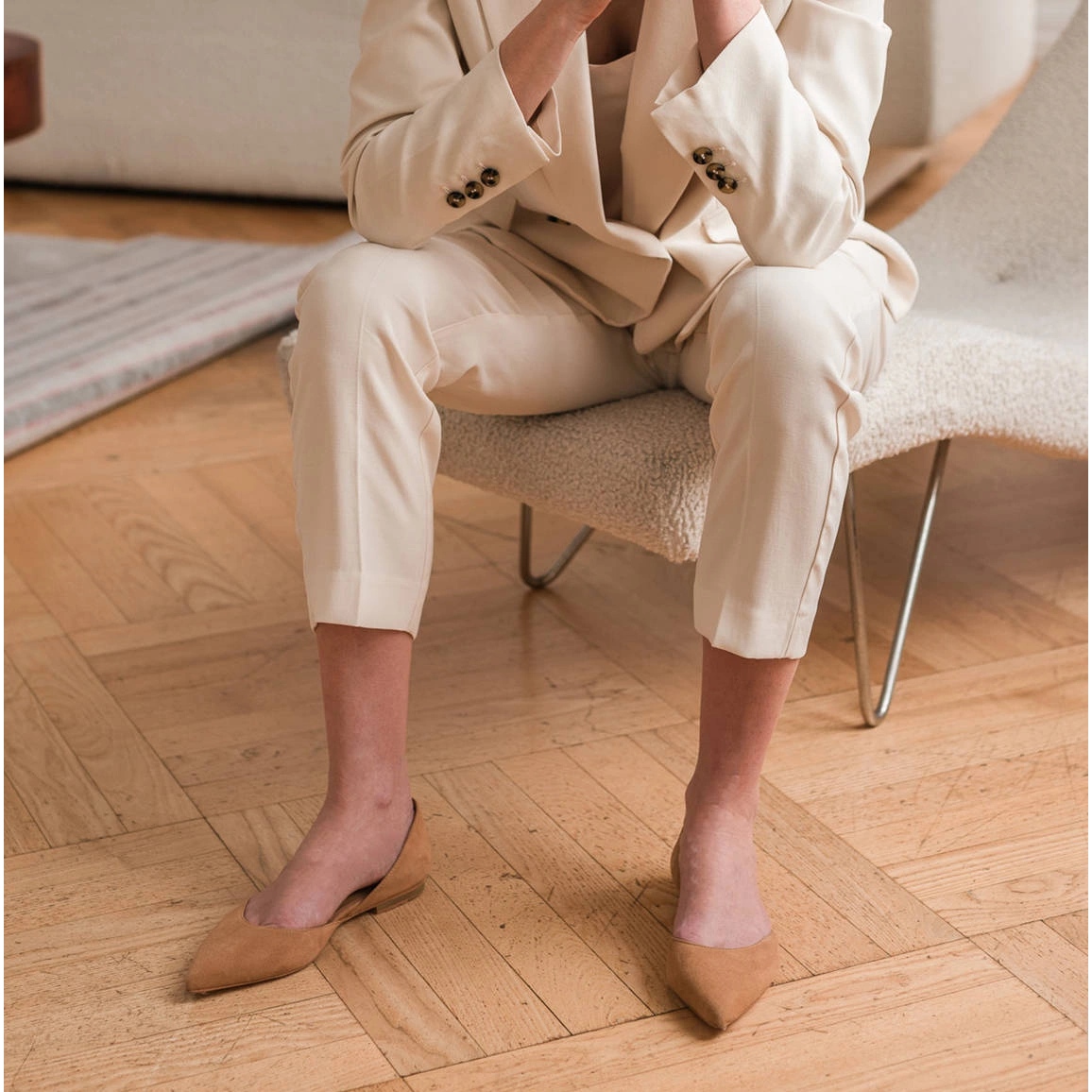 As sapatilhas caracterizam-se pela biqueira pontiaguda, o que lhes confere elegância e faz com que se adaptem perfeitamente tanto aos estilos casuais como aos mais elegantes. Confeccionados em couro camurça natural de alta qualidade, oferecem conforto e durabilidade, além de um visual elegante.