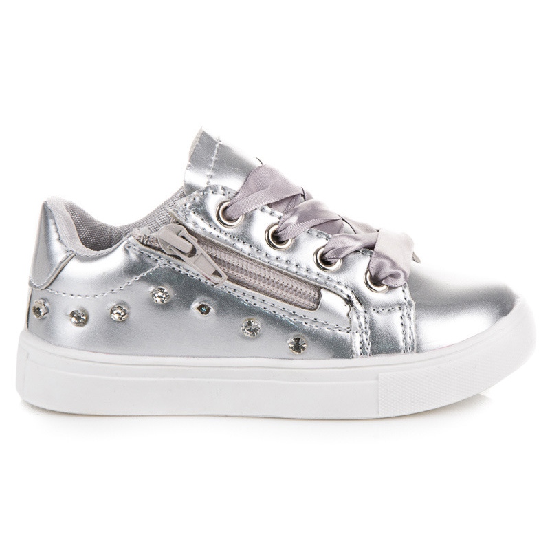 Tênis estilosos para meninas que combinam um look fashion com o conforto do dia a dia. O cabedal confeccionado em couro ecológico em tom prateado levemente cintilante é decorado com cristais na parte externa, e uma atraente fita em vez dos tradicionais cadarços acrescenta charme feminino. O modelo também vem equipado com um prático zíper que facilita a colocação e a retirada do calçado.