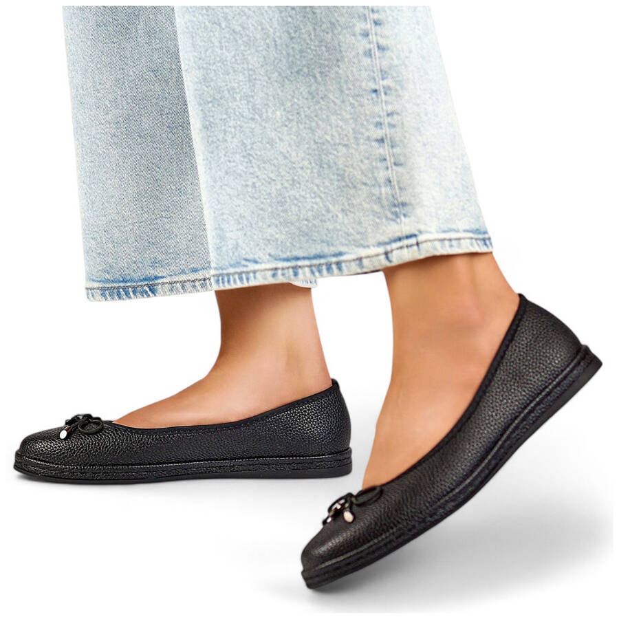 Graças aos arcos, as bailarinas são distinguidas por um sutil, mas ao mesmo tempo com um sotaque elegante, perfeitamente adequado às tendências da moda. Eles se misturam bem em estilizações casuais, e sua cor preta clássica facilita a combinação com várias roupas.