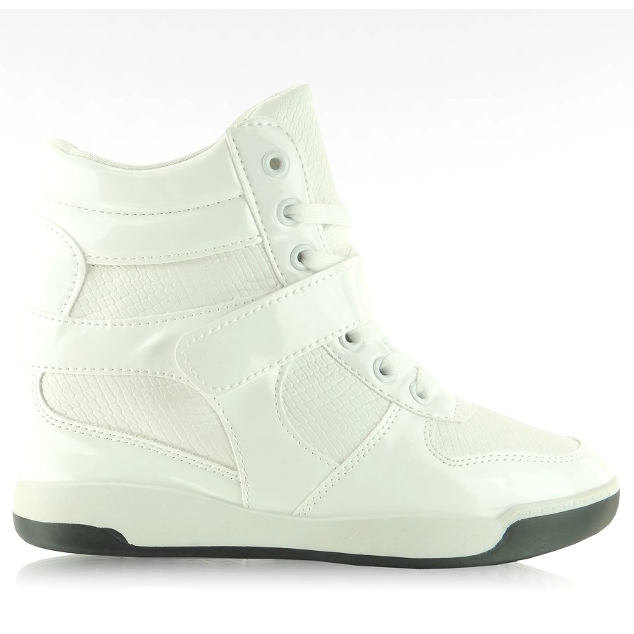 Tênis Move Yourfoot BKA-84 - modelo branco, estiloso e leve, combinando uma elegante textura lacada com um sutil motivo de pele de cobra. Uma inserção branca contrastante na sola acrescenta frescor e alivia visualmente a figura. Os calçados são macios, muito leves e a cunha alta de 6 cm confere altura adicional mantendo o conforto.