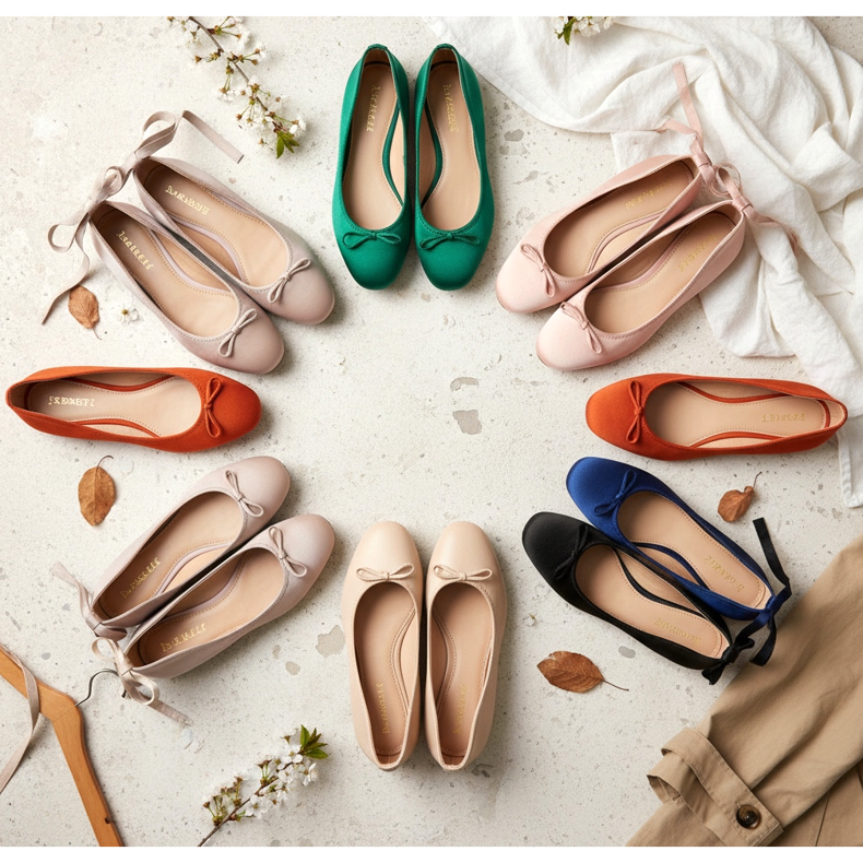 A paleta de cores das bailarinas da temporada 2026 é impressionantemente ampla. Os tons clássicos de nude, bege e preto continuam indispensáveis - são cores que combinam com tudo e são perfeitas para qualquer ocasião.
